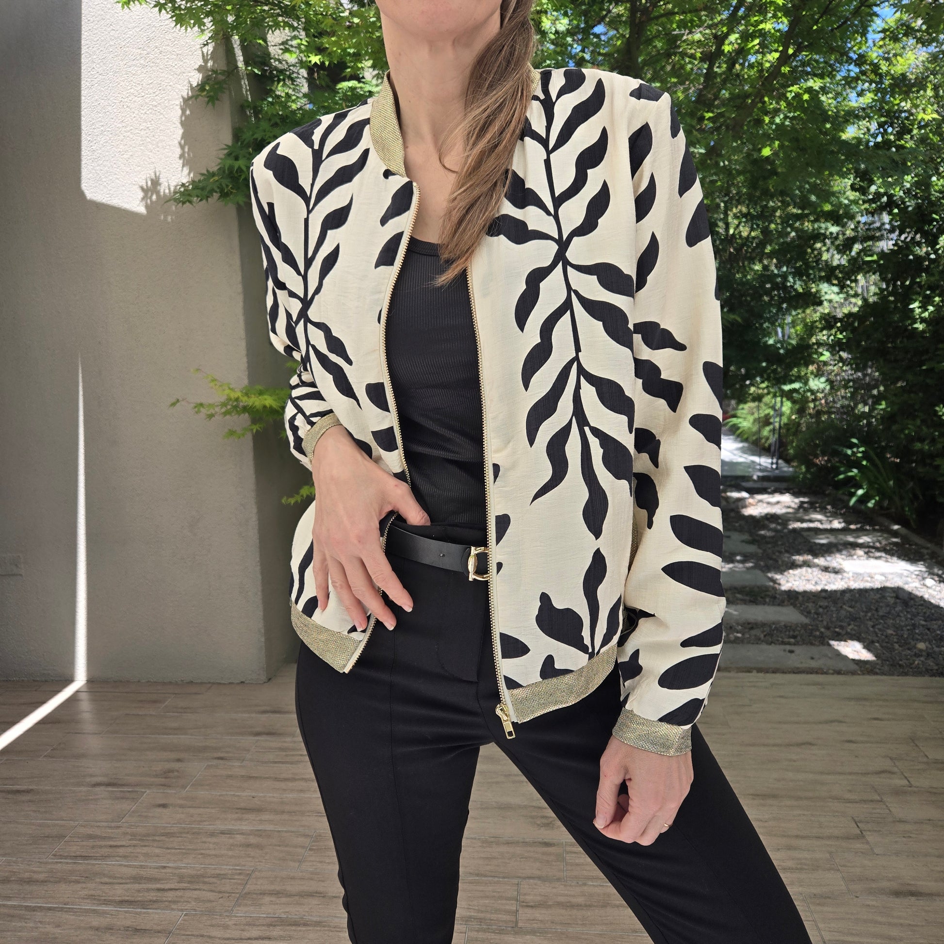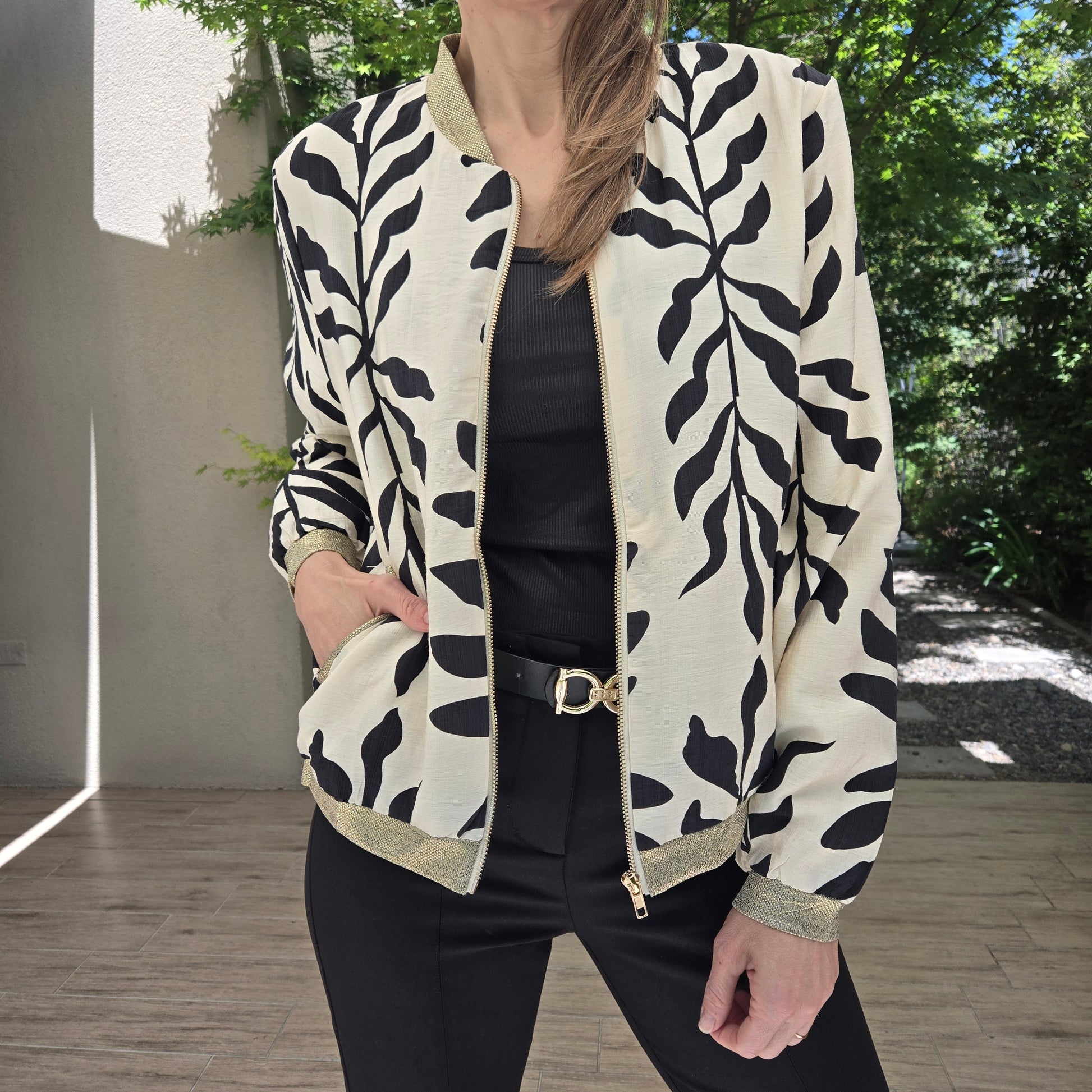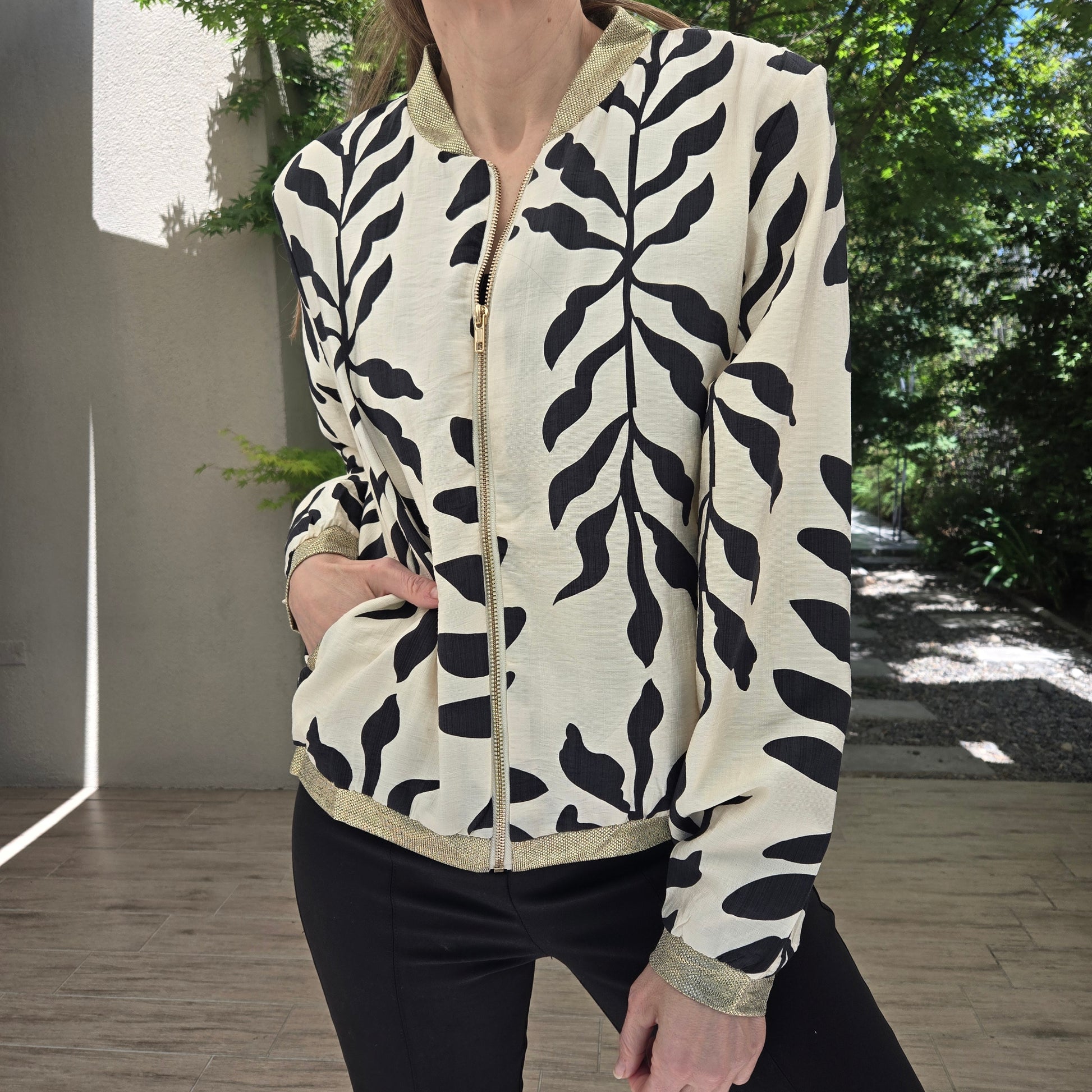 Chaqueta Bomber de fibra de seda, con bolcillos. Puños y cuello en dorado.