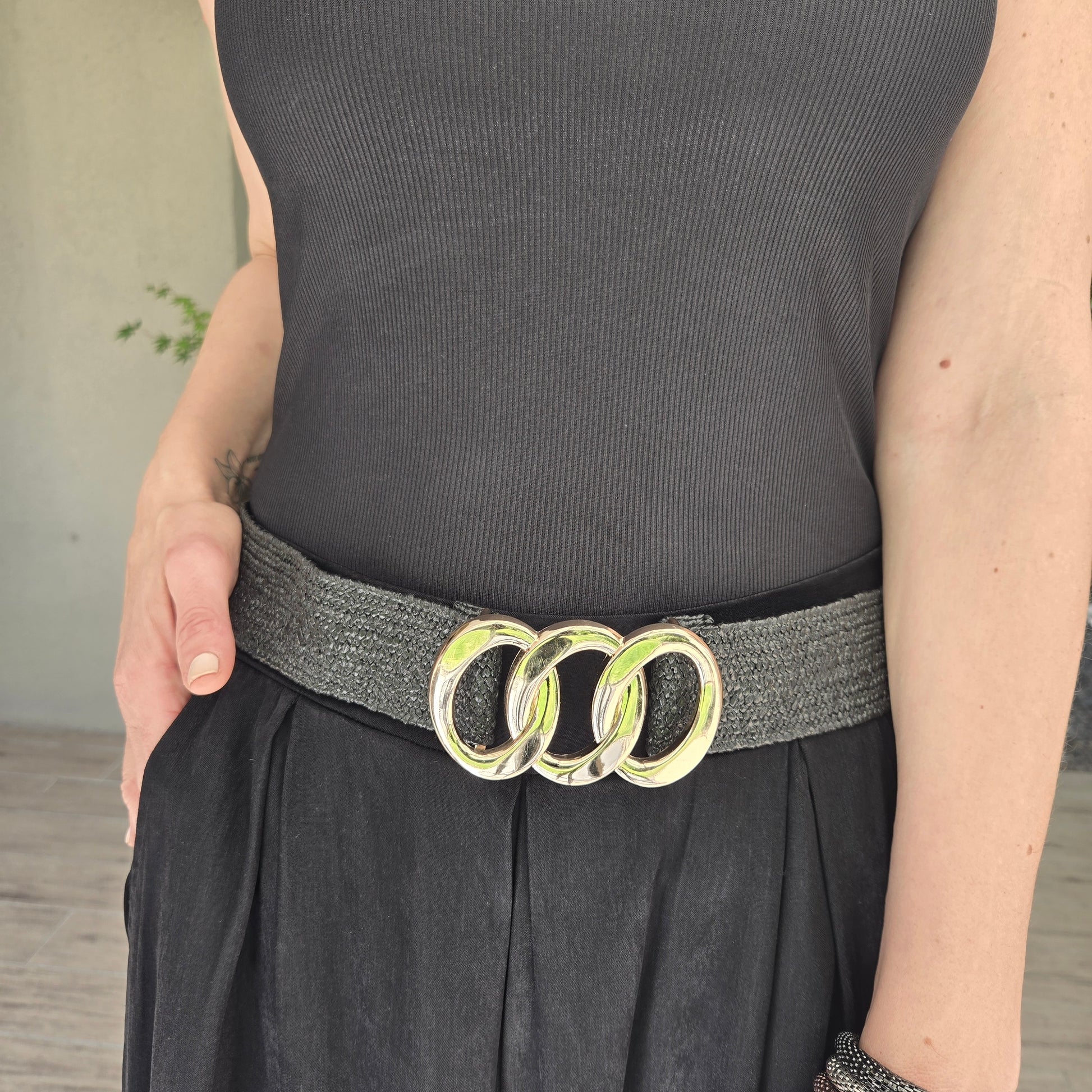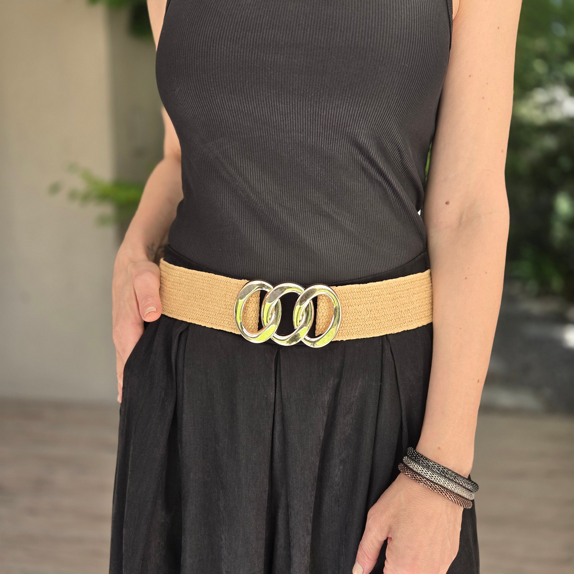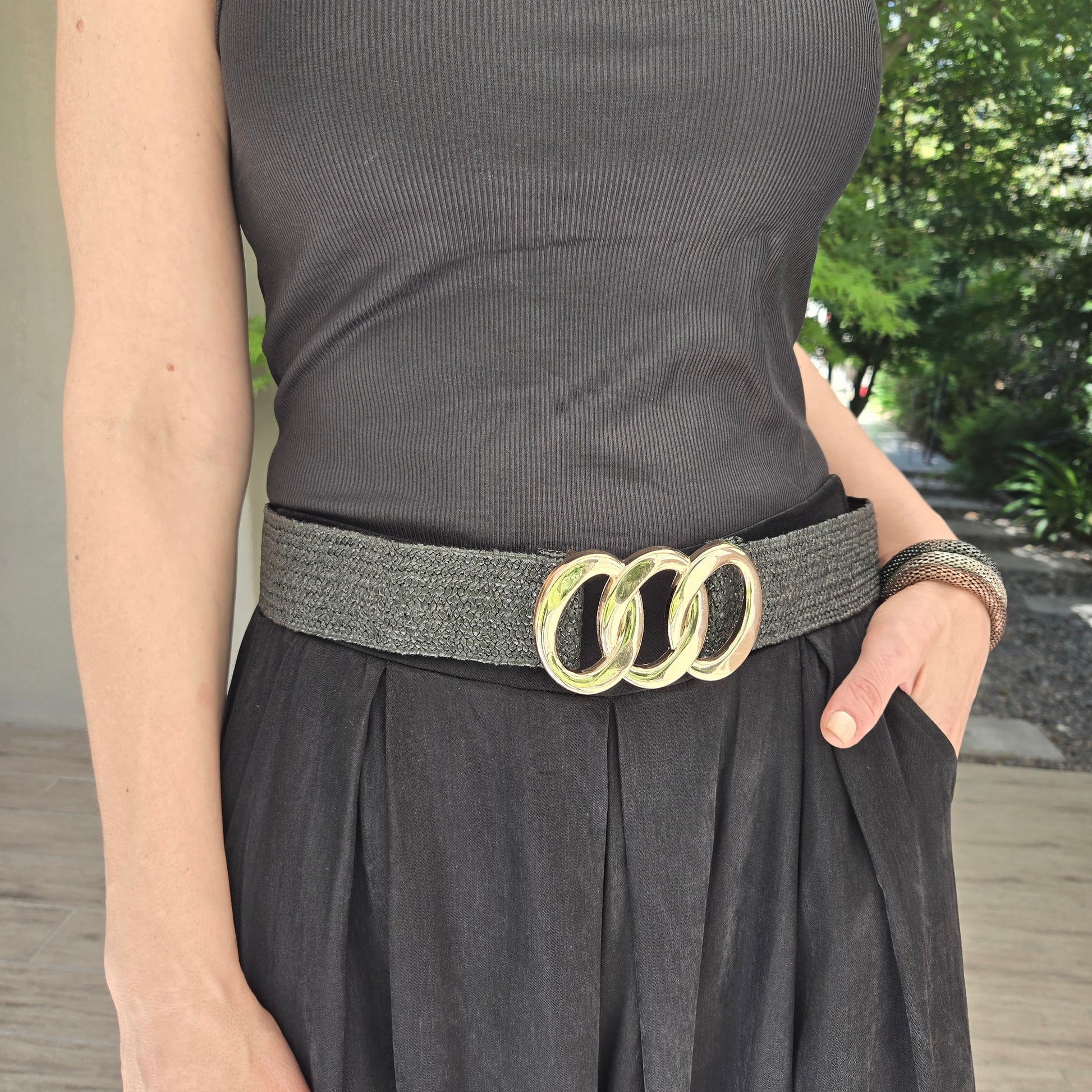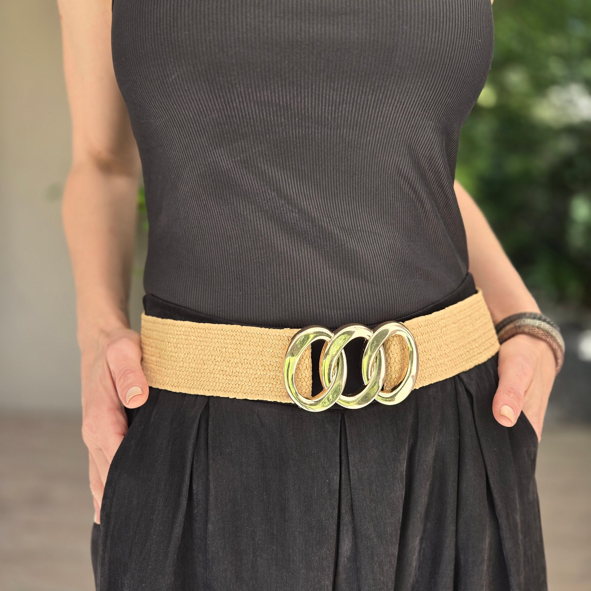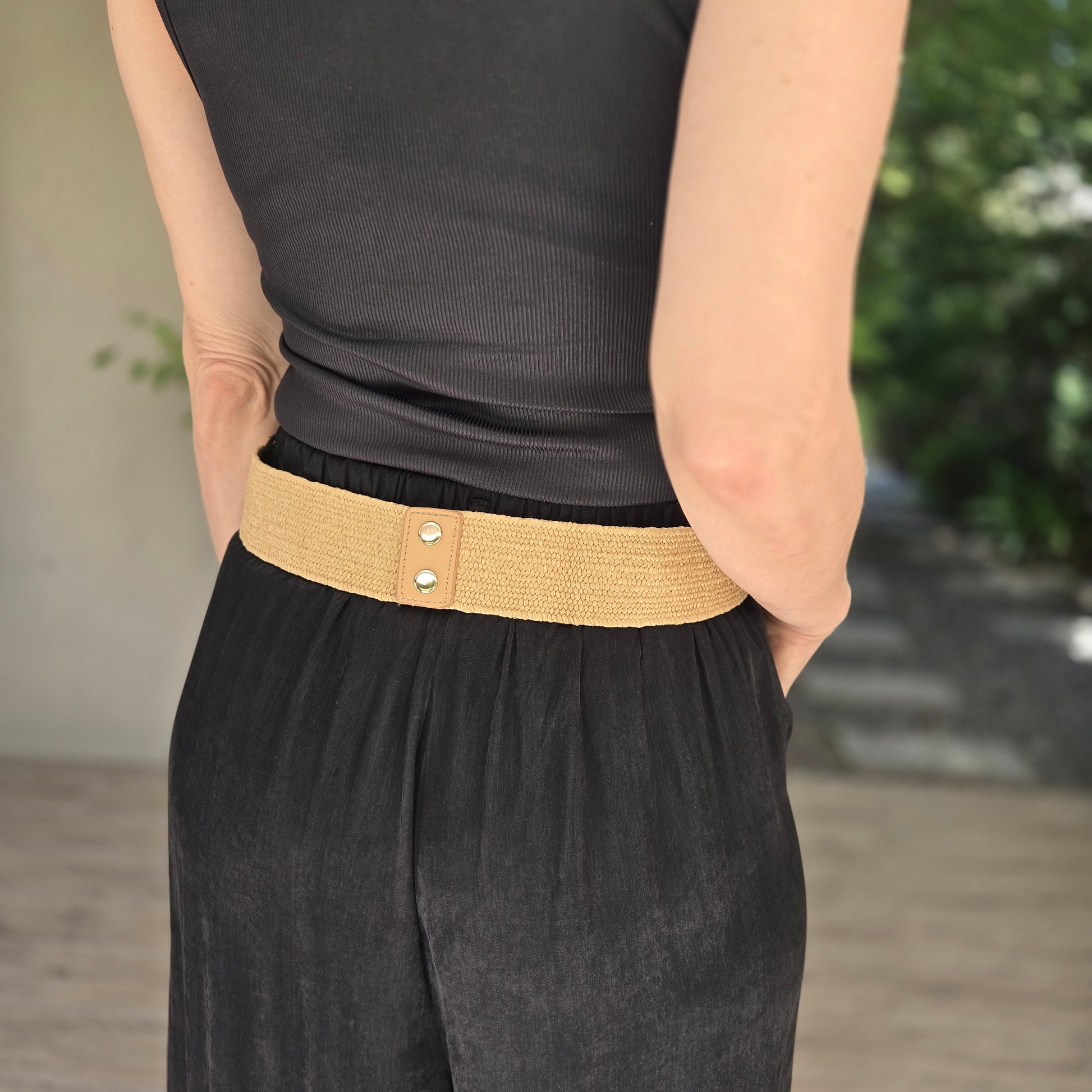 Cinturón de Rafia elastizada con hebilla metálica, se abrocha atrás