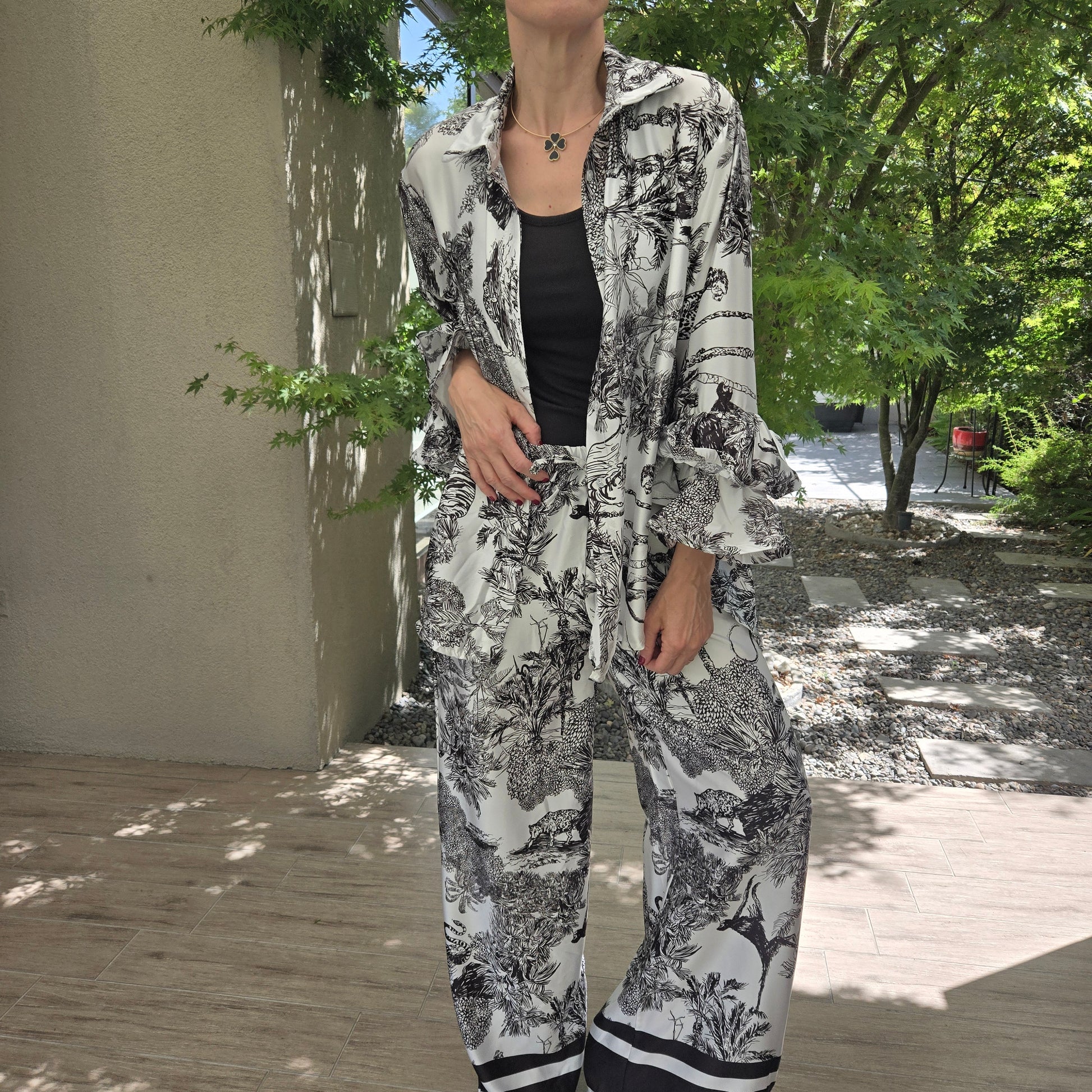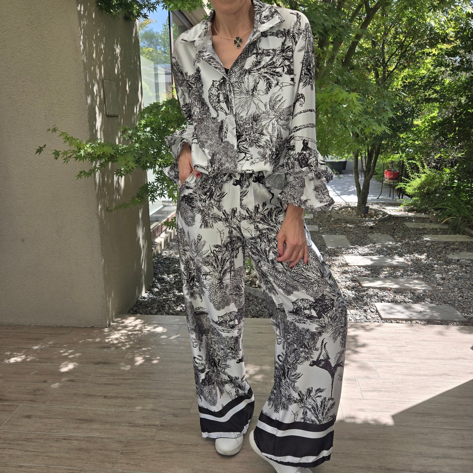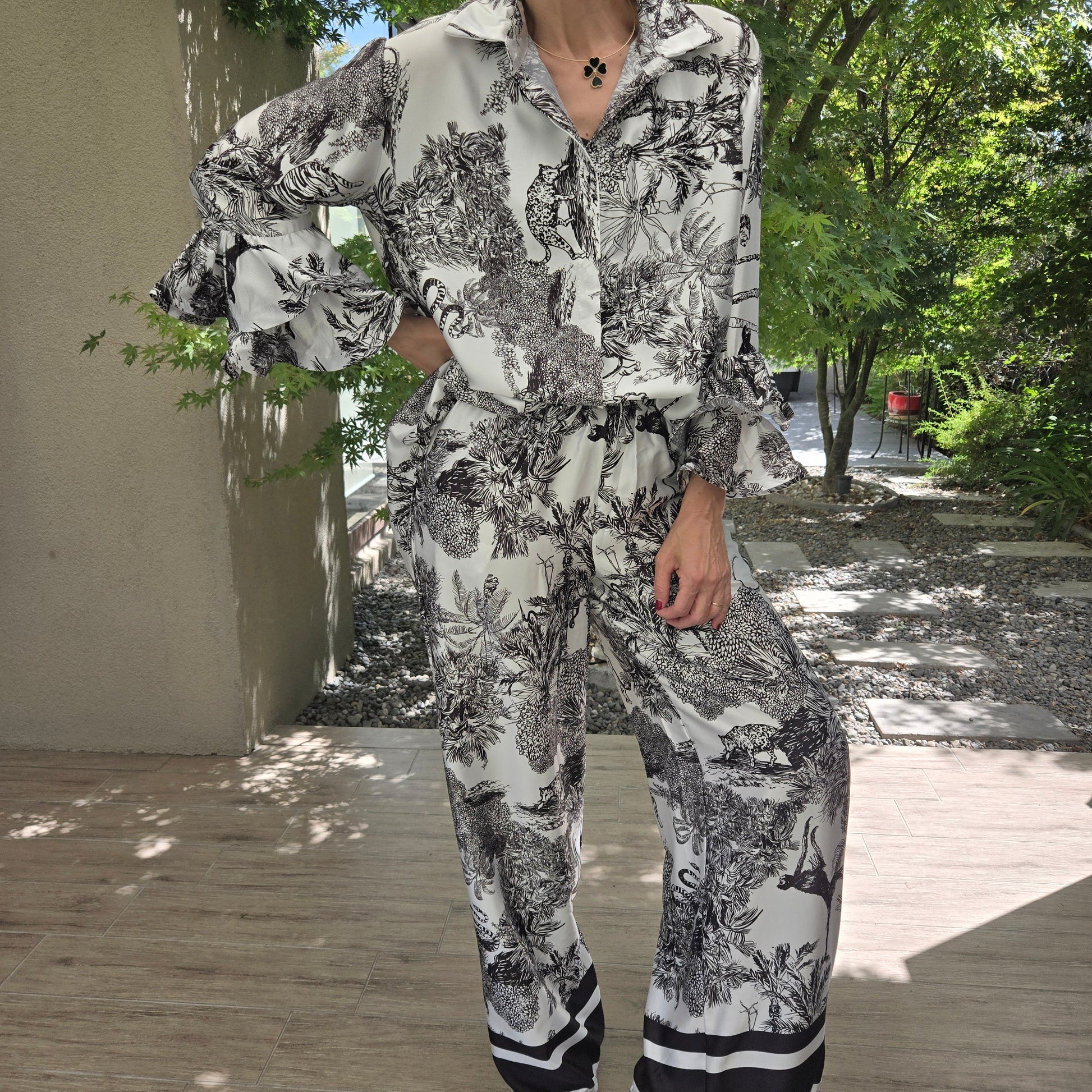 Conjunto de Raso Italiano, pantalón con bolsillos, blusa con volados en manga.