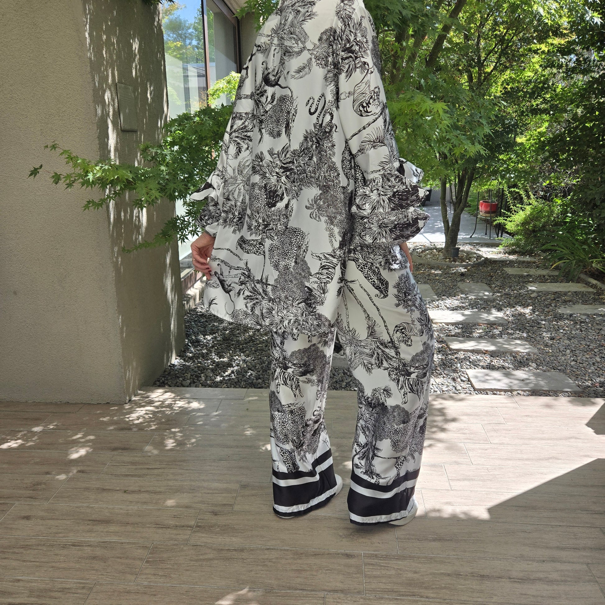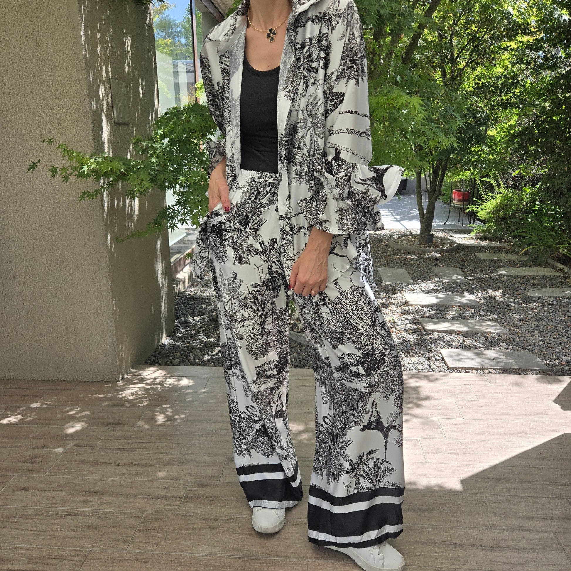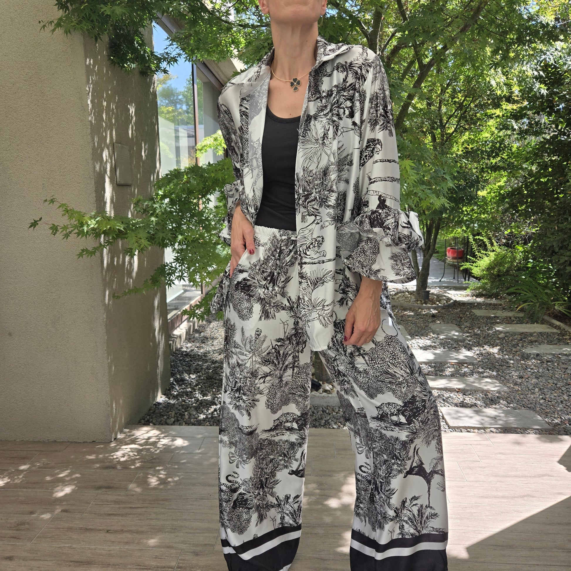 Conjunto de Raso Italiano, pantalón con bolsillos, blusa con volados en manga.