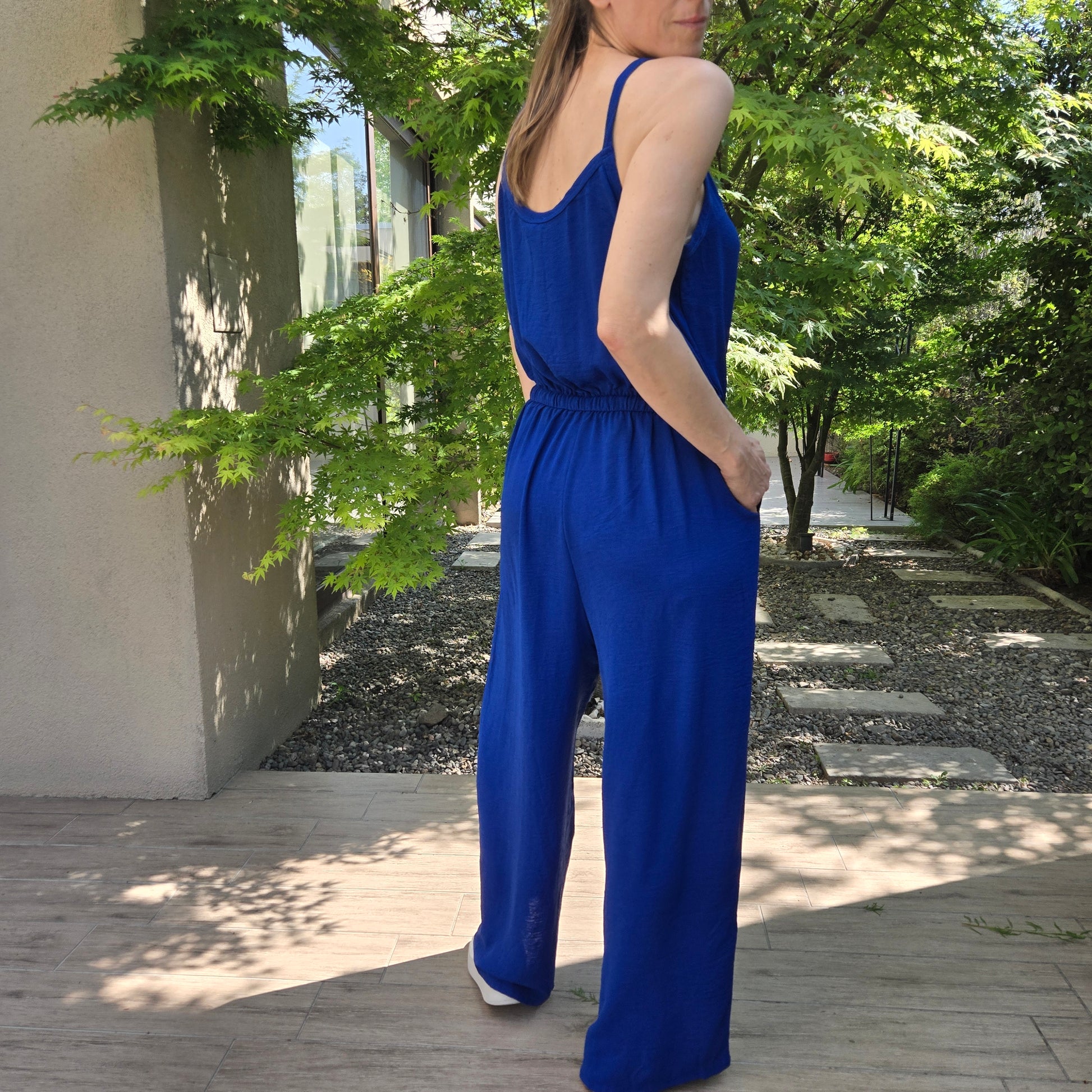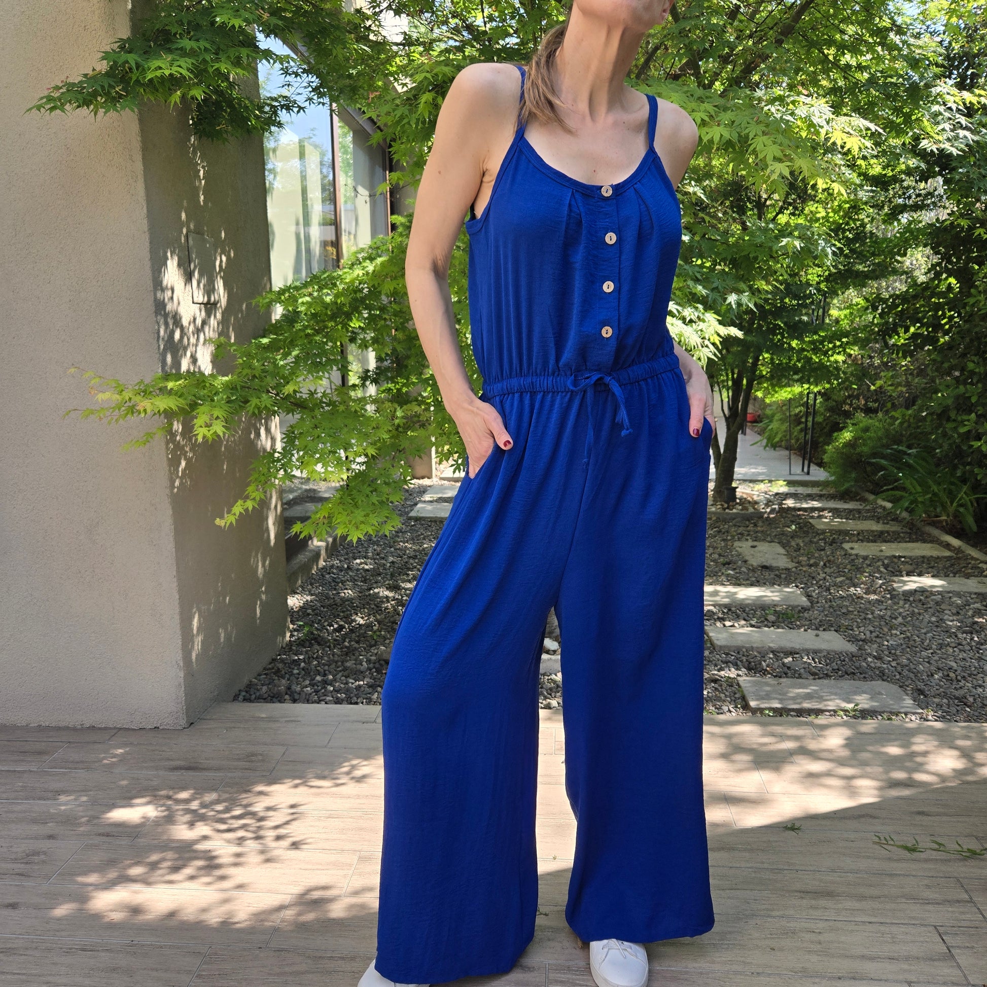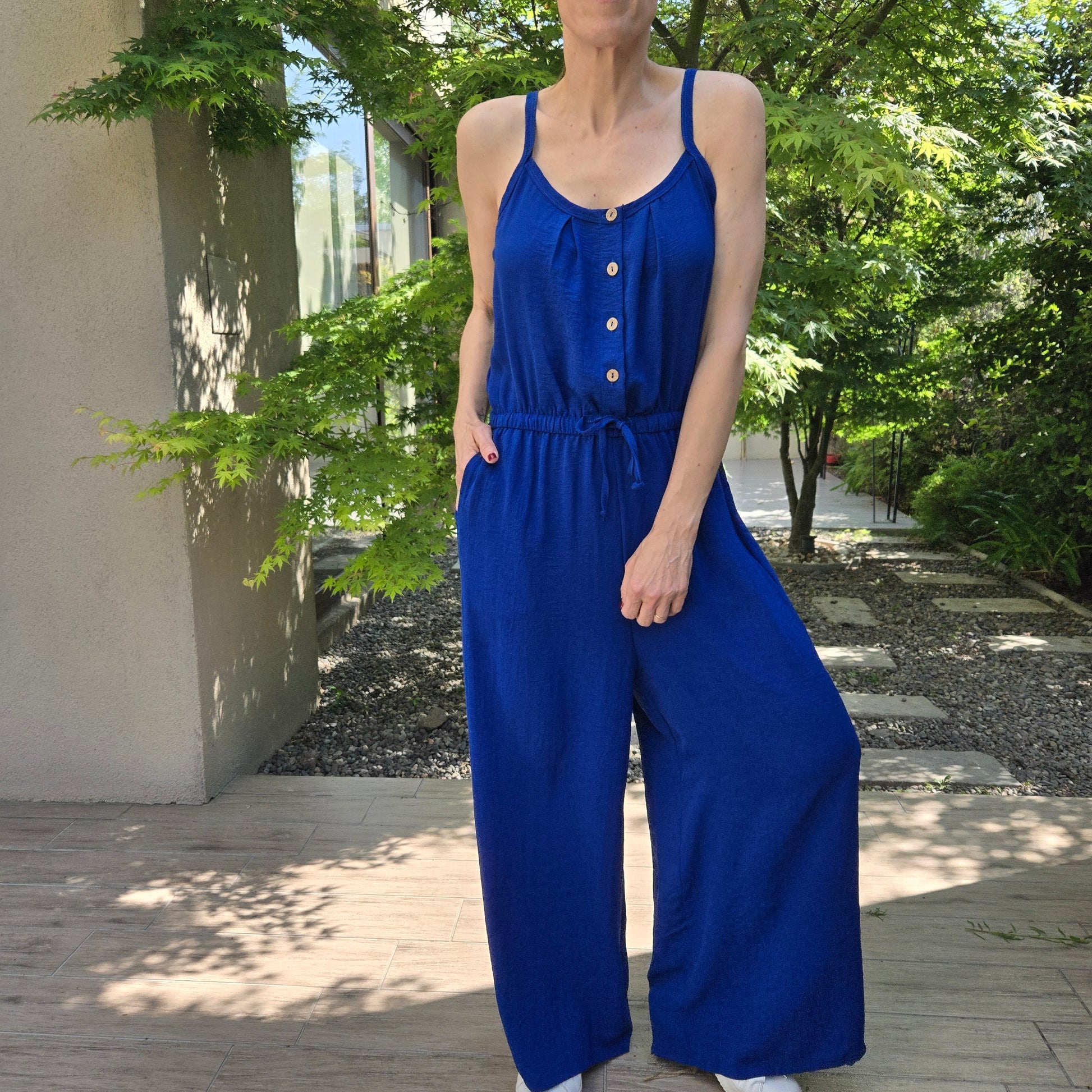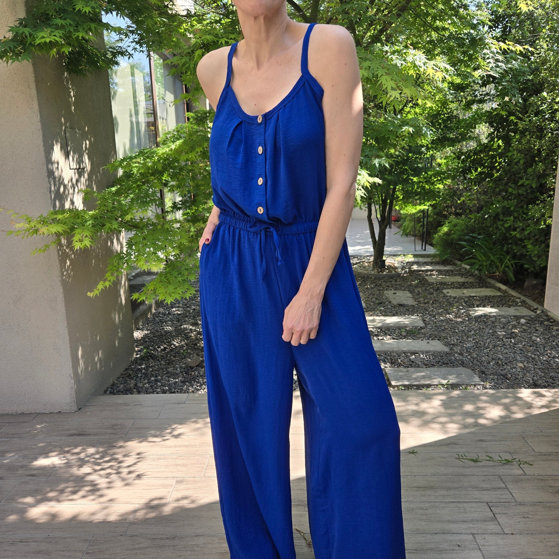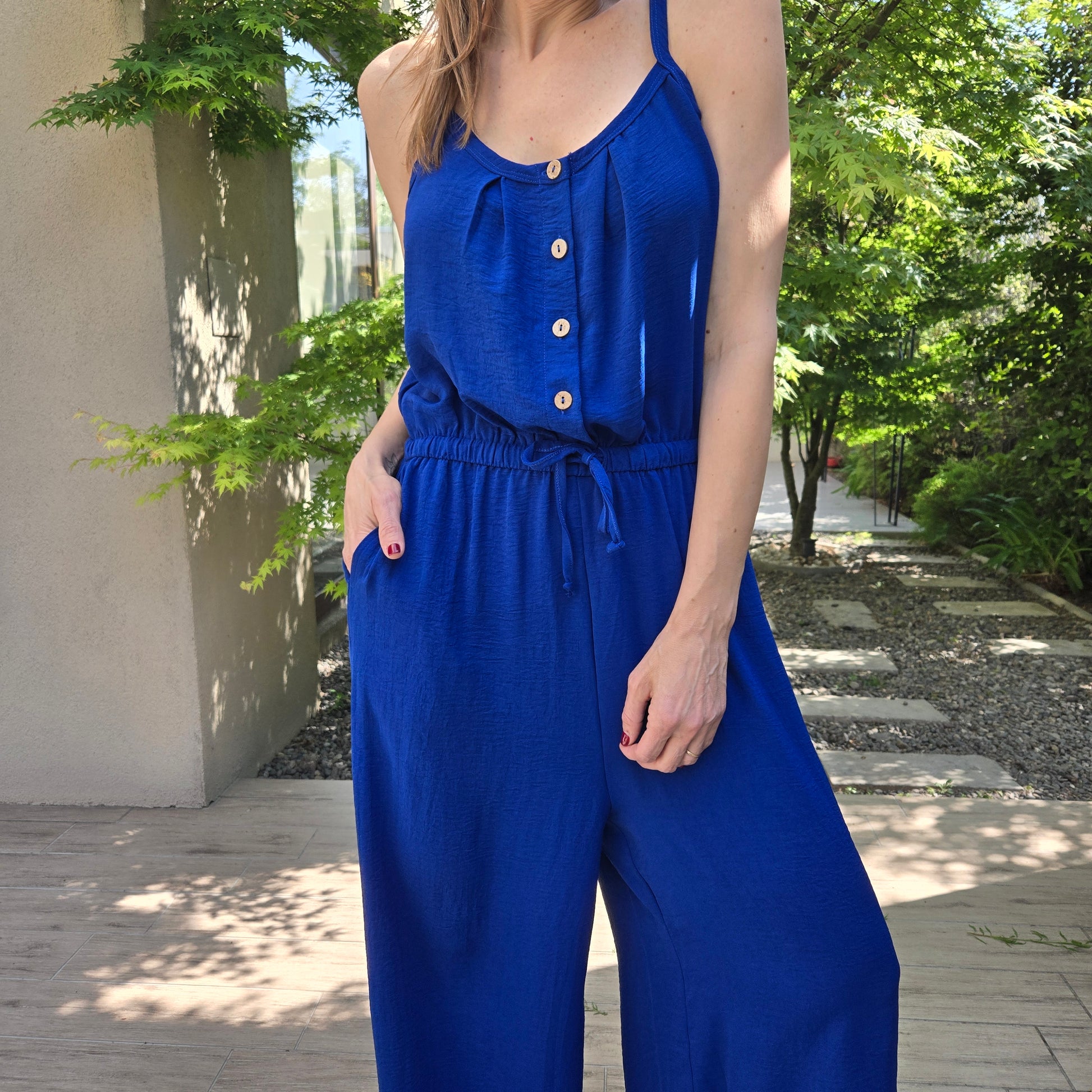 Enterito de crepe elastizado con cordón de ajuste y bolsillos.